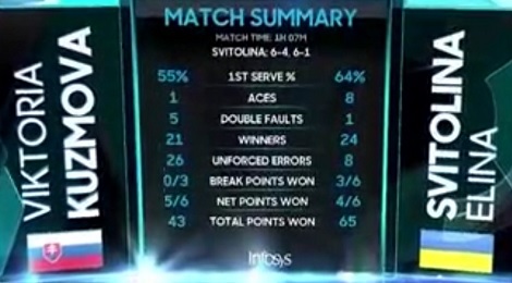 Вторая партия началась в том же ключе, но в четвертом гейме Свитолина немного неожиданно трижды приняла навылет вторую подачу словачки. Стало ясно, что на этом Виктории можно на сегодня заканчивать. До конца сета Элина не испытывала проблем, сделала еще один брейк и завершила матч эйсом, который стал восьмым в матче (при одной двойной).