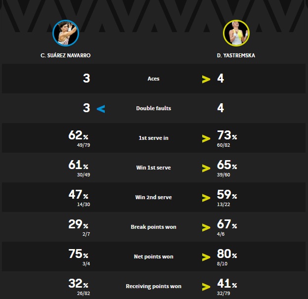 Во втором сете Даяна повела 2:0 и доминировала на корте. Но в какой-то момент она неожиданно расслабилась, а уже почти списанная в утиль Суарес Наварро уцепилась зубами за этот шанс и полностью перевернула игру. Испанка заиграла сильнее, а украинка не смогла вовремя перестроиться. Как итог – пять проигранных геймов и отдача партии. Особо стоит отметить эпизод в 8 гейме, когда Суарес Наварро сделала какой-то невероятный укороченный, который благодаря нижнему вращению вернулся на ее сторону корта после того, как ударился на половине Ястремской. Не часто такое доводится увидеть, загадывайте желание.