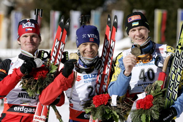 Призеры спринта ЧМ-2007: чех Михал Шлезингр, норвежец Уле Эйнар Бьорндален и украинец Андрей Дериземля