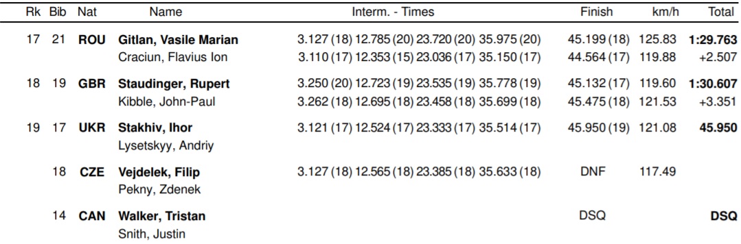 Украинцы Игорь Стахив и Андрей Лисецкий заняли 19-е место. Чемпионами стали немцы Тони Экерт и Саша Бенекен.