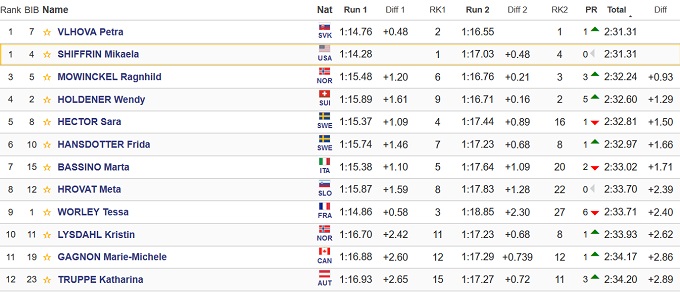 Гигантский слалом в словенском Мариборе принес нам сразу двух победителей – Микаэла Шиффрин и Петра Влхова показали абсолютно идентичные результаты. Третье место заняла норвежка Рагнхильд Мовинкель.