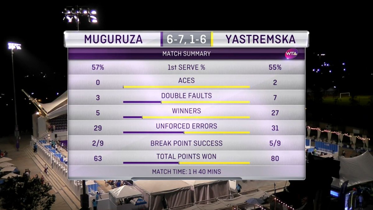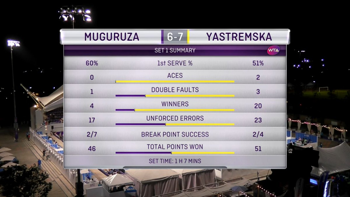 Ястремская чуть хуже начала поединок. Как и до этого, были проблемы на первой подаче, а также немного провисал бэкхенд. При счете 3:2 в пользу Мугурусы Даяна пообщалась с тренером, и Оливье Женом дал ей несколько дельных тактических советов. Результат появился мгновенно: два выигранных гейма соперницы, взятые под ноль. Ястремская напомнила, как она может атаковать с приема, несколько раз пробив навылет даже после первой подачи. К сожалению между этими геймами не удалось защитить свою подачу и интрига в партии завертелась еще сильнее. При счете 6:5 Даяна заработала двойной сетбол, очень вовремя помогла двойная от Гарбинье. Но с первого раза украинка пробила в сетку с удобной позиции, а со второго – испанка попала точно в линию, чем немного сбила Ястремскую.