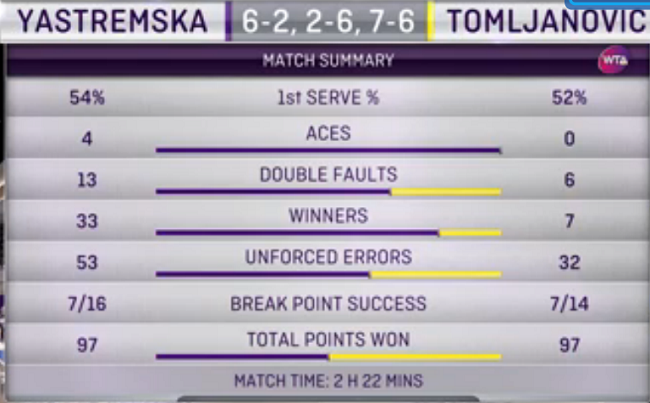 А те, як вона підняла собі мораль при рахунку 2:5 - просто фантастично і неперевершано! Цей матч обовязково принесе нашій українській тенісній зірочці досвід і психологічну стійкість.