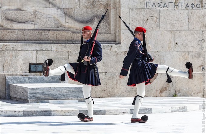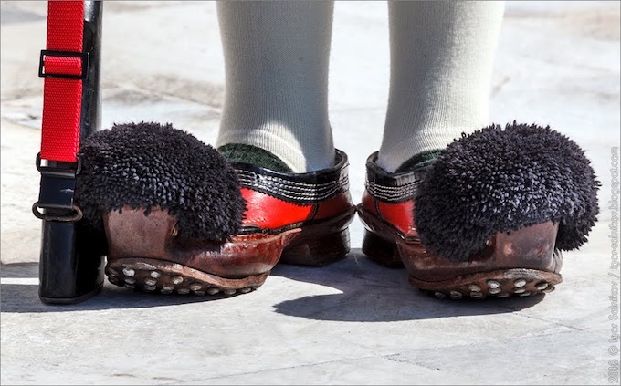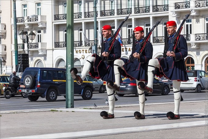 Именно за тем, чтобы увидеть синхронное движение солдат, здесь собираются толпы зевак. Обращает внимание необычный строевой шаг и униформа, особенно обувь, эвзонов. Кстати, этот уникальный ботинок с помпоном весит до пяти килограммов и подбит 60 гвоздями.