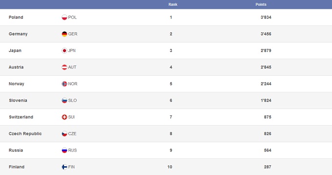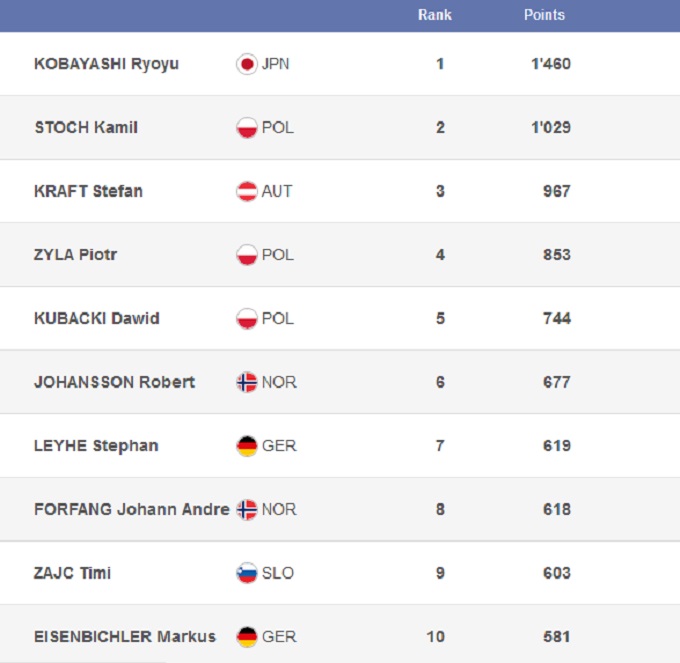 В Лахти же Камил одержал вторую победу подряд, при чем победа эта была разгромной: более 13 баллов преимущества над финишировавшим вторым Рёю Кобаяси. Вчерашняя победа для Стоха стала уже 33-й в карьере на этапах Кубка мира. По этому показателю он сравнялся с легендарным немцем Йенсом Вайссфлогом. Показатель Янне Ахонена (36 побед) также находится в непосредственной близости от Стоха.