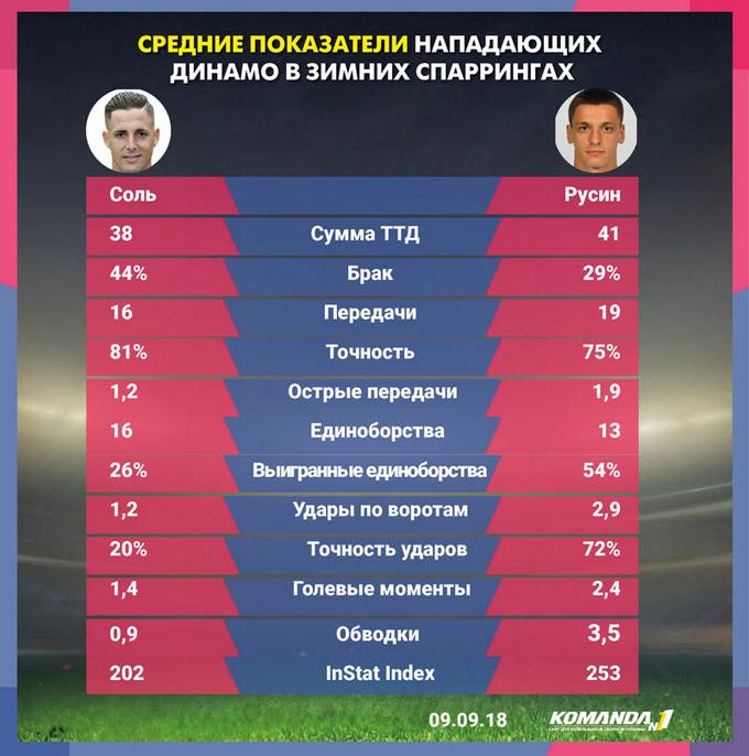 Во всех контрольных матчах «Динамо» на учебно-тренировочных сборах испанский новичок Фран Соль нанес один удар в створ ворот, а Назарий Русин забил четыре мяча.