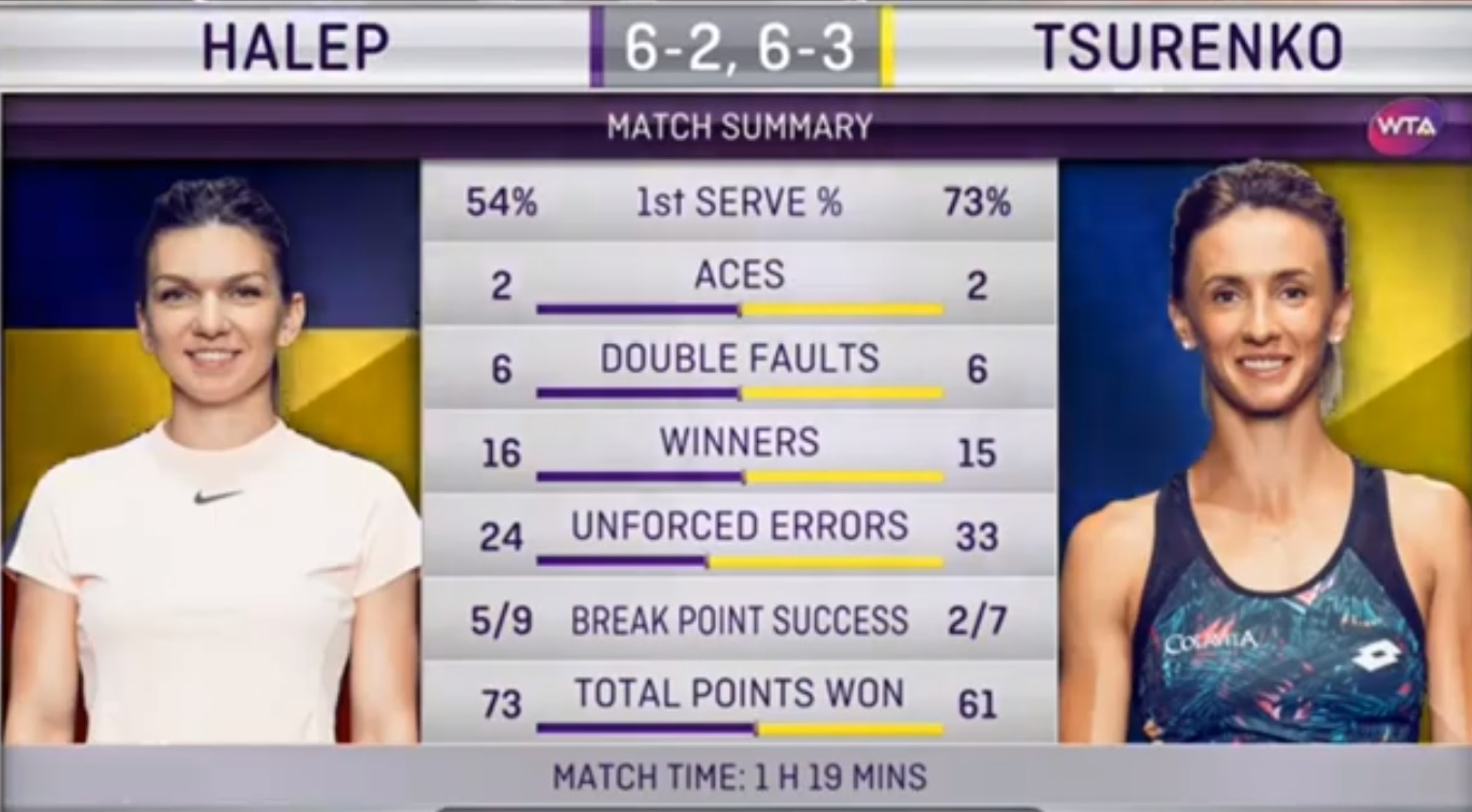Из позитива стоит отметить неплохую работу форхенда, иногда получалось очень хорошо направлять мячи по линиям, но таких моментов было мало. Да и Халеп хорошо двигалась, чего не скажешь о ее ударах.