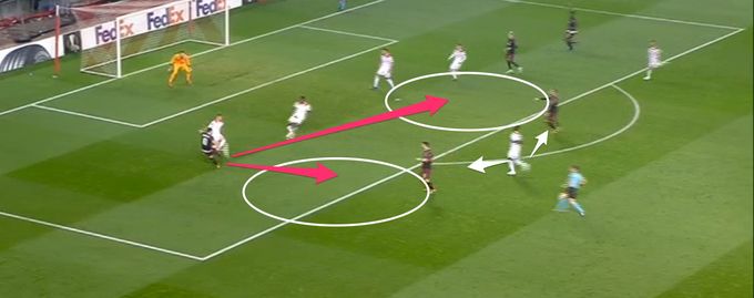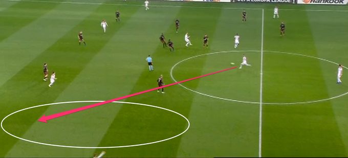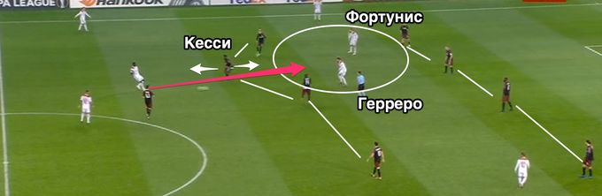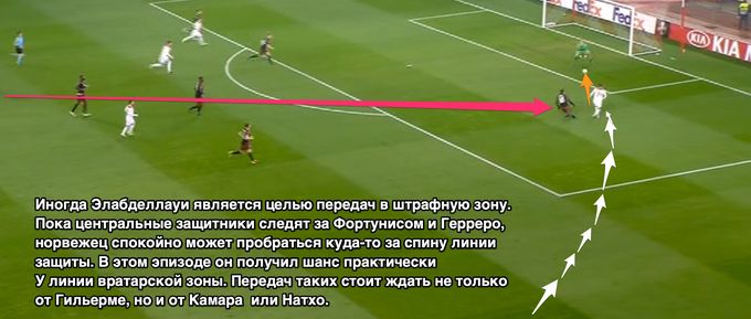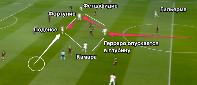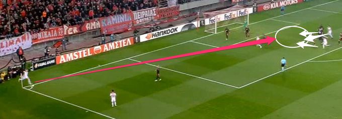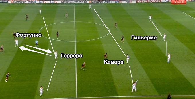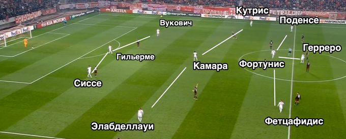 Также хочется еще раз вспомнить про перегруз зон в центре. Когда ряд футболистов сбегается на какой-то участок поля около центрального круга, защитники с противоположного фланга продолжат держать свою позицию и ждут переводов в свободные зоны. Имея в центре поля Гильерме и Фортуниса, «Олимпиакос» хорошо и вовремя разворачивает атаки и дает фулбекам много оперативного пространства на бровке.