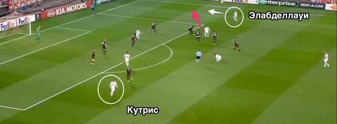 При чем «Олимпиакос» всегда высоко держит обоих своих фулбеков, не опираясь на направление атаки. И Кутрис, и Элабделлауи (кстати, он норвежец) вполне могут одновременно находиться где-то по линии защиты соперника, одновременно растягивая оборону «Динамо», но одновременно оголяя свои фланги под контратаки. Здесь динамовцам не помешало бы подготовить своих фланговых игроков к моментальному доставлению мячей на фланги при обрезках «Олимпиакоса».