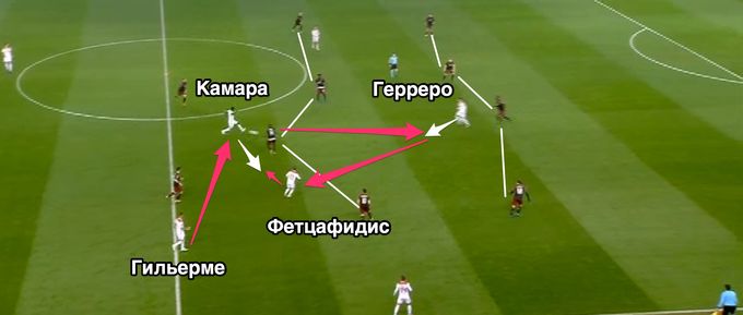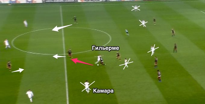 Здесь еще стоит отметить то, что Гильерме, хоть и начинает большинство атак в глубине, не проводит все время за спинами партнеров и постепенно переходит выше в центр поля, а схема превращается в заявленные 4-2-3-1. В таких случаях все полузащитники и игроки атаки сбиваются возле центрального круга и команда создает перегрузы в центральной зоне.