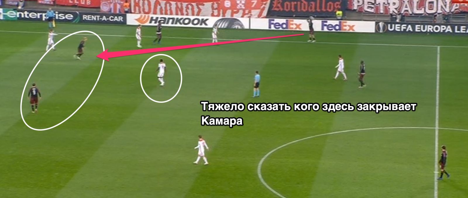 Даже когда команда не сталкивается с проблемой обрезкой, у них все равно остаются трудности с перекрытием центра поля. Во-первых, все по той же причине недостатка мощи у Гильерме. Во-вторых, молодой атлетичный Камара тоже не является (на данный момент) топом разрушителем и очень много ошибается при выборе позиции в обороне. С «Миланом» мы насчитали целый ряд моментов, где Камара «плавает» во время позиционной обороны команды.