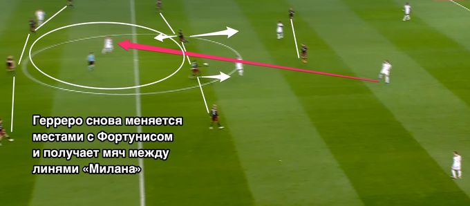 На следующем кадре уже можно увидеть другой пример перегруза, в котором Герреро с позиции центрального нападающего опускается в линию полузащиты, а левый полузащитник Поденсе со своего фланга приходит в центр на его место. В итоге, двое опорных полузащитников «Милана» снова оказываются в меньшинстве на своей половины половине поля: 2 на 4 в пользу хозяев.