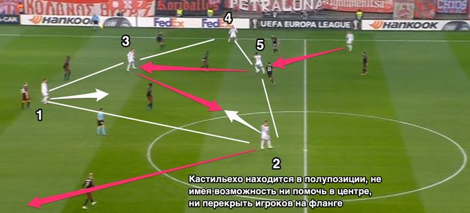 Мы уже немного затронули тему голых флангов «Олимпиакоса» и того, что может произойти (и должно происходить в матчах с «Динамо»), когда команда обрезается. Хотелось бы сейчас обратить внимание на то, что пытались использовать «Милан» и «Бетис» в матчах с командой Педру Мартинша. У «Олимпиакоса» построена очень тяжелая конструкция в атаке, которая подразумевает не только высокое использование фулбеков, но и постоянное вертикальное движение полузащитников. В подавляющем большинстве случаев в опорной зоне «Олимпиакоса» не остается никого, кроме Гильерме, который самостоятельно не вытягивает всю черновую работу.