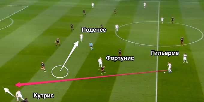 Прежде всего, хочется отметить комбинацию, которую зачастую используют на левом фланге: левый полузащитник смещается в центр, а Кутрис, находясь максимально высоко, выжидает длинную передачу от Гильерме. Дальше идет рывок левого защитника и бразилец (чаще всего эта передача идет верхом за шиворот крайнему защитнику соперника) запускает мяч ему на ход.