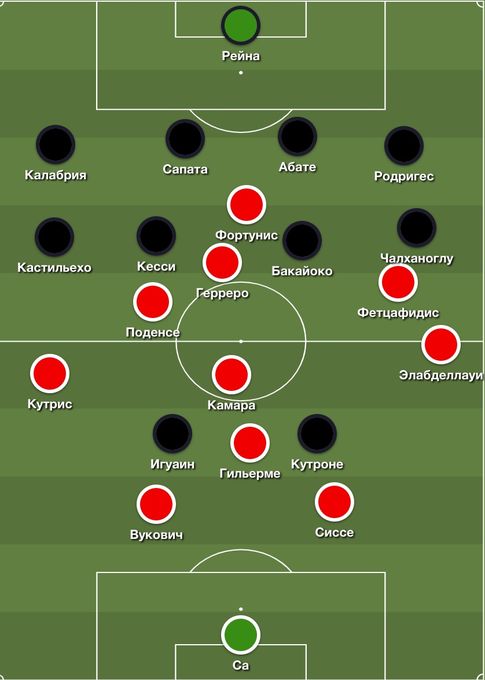 Номинально «Олимпиакос» играет по схеме 4-2-3-1 с двумя игроками в передней линии, которые постоянно друг друга сменяют на разных участках поля. Также нужно отметить, что Герреро и Фортунис часто оказываются одновременно вдвоем на острие атаки, превращая расстановку в 4-4-2. Кстати, эти двое часто меняются местами: Фортунис может оказаться на самом острие атаки, а Герреро вполне может быть найден в глубине поля или даже на фланге (кстати, именно на позиции левого полузащитника он провел концовку матча с «Миланом» после выхода Натхо). Также у Мартинша есть в арсенале расстановка 4-1-4-1, которую он использовал, например, в матче с «Бетисом». Там Фортунис выступил в роли центрфорварда, но, с учетом того, что он может из-за повреждения пропустить первую игру, (хотя Мартинш сказал, что он готов) именно Герреро может в одиночку выйти в сегодняшнем матче. Обо всех нюансах дальше и поговорим.