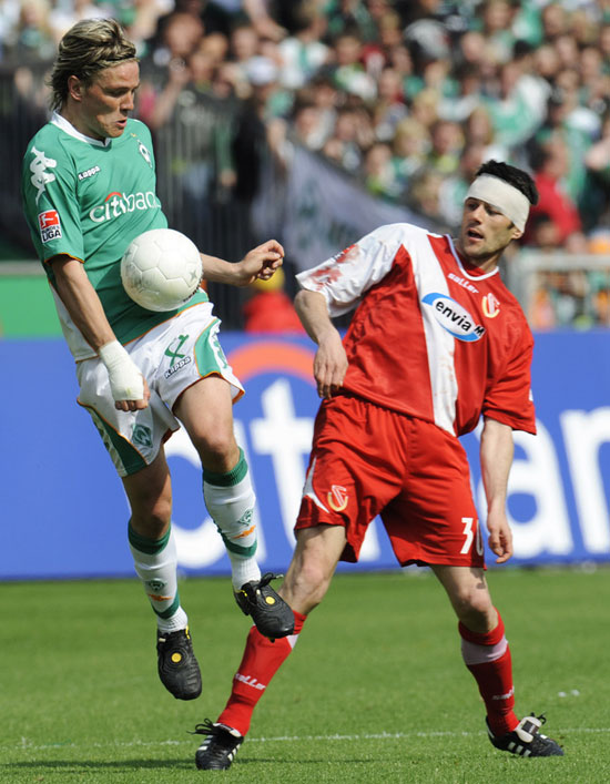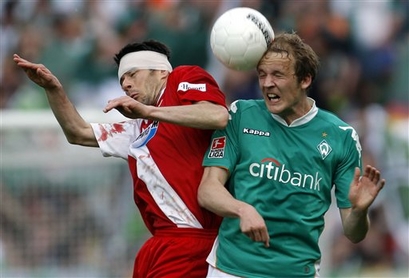 А так играют в Германии. Бременец Клеменс Фриц с больной рукой, коттбусовец Бранко Йелич - головой.