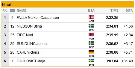 У женщин защитить свой чемпионский титул 2-летней давности сумела норвежка Майкен Касперсен Фалла. Она опередила олимпийскую чемпионку в спринте Стину Нильссон и еще одну норвежку, Мари Эйде.