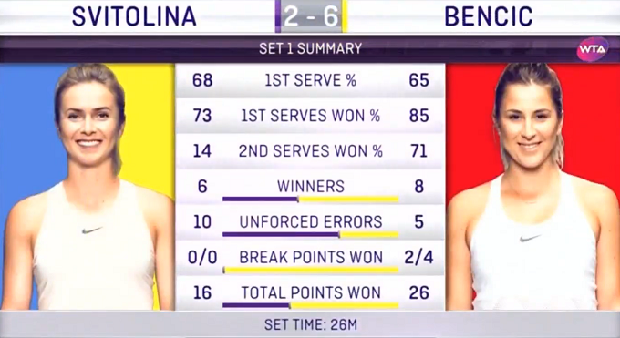 Начиналось сегодня все как в страшном кошмаре. Бенчич захватила инициативу, доминировала на приеме, а Свитолина абсолютно не понимала что делать и как побеждать. Мощная швейцарка словацкого происхождения первой начинала атаковать в розыгрышах и чаще всего выигрывала. Вторая подача Свитолина была полностью разбита, Бенчич атаковала с приема и позволила Элине выиграть только 1 очко из семи. Результат такого избиения был закономерен - быстрое поражение за 26 минут.