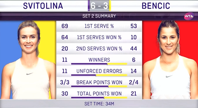 Начало второго сета не предвещало ничего хорошего, но после нескольких наставлений Эндрю Беттлса Свитолина заиграла намного активнее, начала принимать мячи ближе к задней линии, что немного удивило соперницу. Стоит отметить всего 10% выигранных мячей Белинды на первой подаче (1 из 10). Это настоящая дикость, увидеть что-то подобное в профессиональном матче малореально.