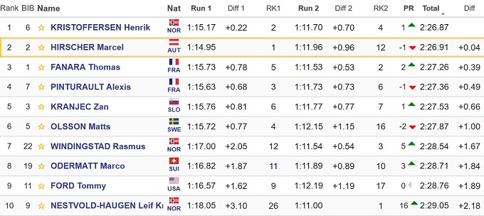 Свежеиспеченный чемпион мира в гиганте Хенрик Кристофферсен выиграл гигант в болгарском Банско, опередив Марселя Хиршера и Тома Фанара.