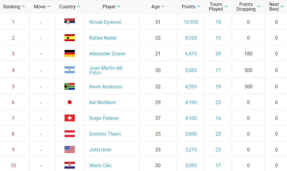 В первой 10-ке рейтинга без изменений. Первой ракеткой мира продолжает оставаться Новак Джокович. Стоит отметить существенное улучшение позиций Ласло Джере, который «прыгнул» на 53 позиции и теперь занимает 37-ю строчку.