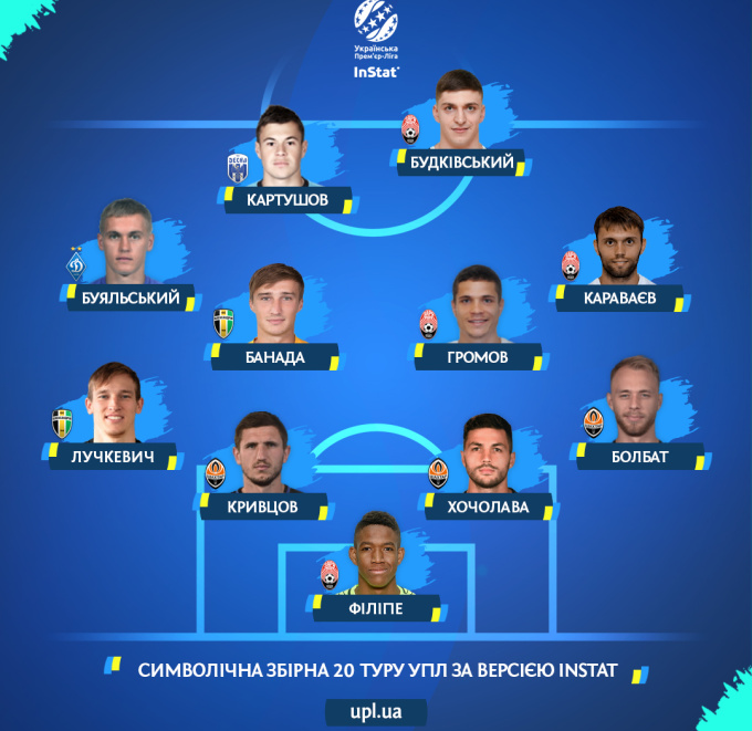 Система InStat по итогам 20-го тура УПЛ составила сборную лучших игроков на своих позициях.