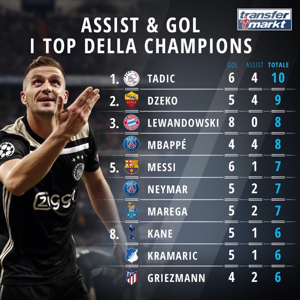 На первом месте находится игрок «Аякса» Душан Тадич (6 голов и 4 ассиста).Обладатель пяти золотых мячей Лео Месси занял лишь пятую строчку (6 голов и 1 передача), а что касается Криштиану Роналду, то его в этом топе нет. Весьма неожиданно на втором месте закрепился Эдин Джеко (9 баллов в сумме), а за ним уже идут Роберт Левандовски (8 баллов), Килиан Мбаппе (8 баллов), а далее уже и Месси.