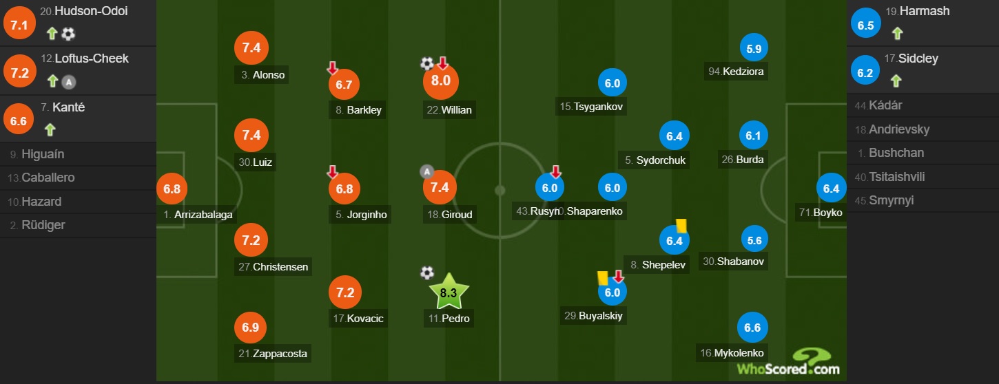 В составе «Челси» лучше всего себя показали вингеры Педро (8,3) и Виллиан (8,0).