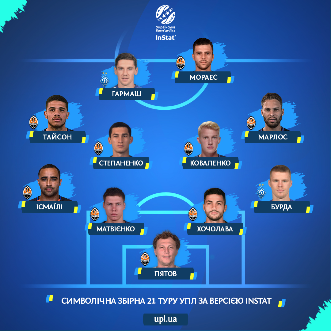 На основі оцінок InStat Українська Прем'єр-ліга склала символічну збірну найкращих футболістів за підсумком 21 туру чемпіонату УПЛ.