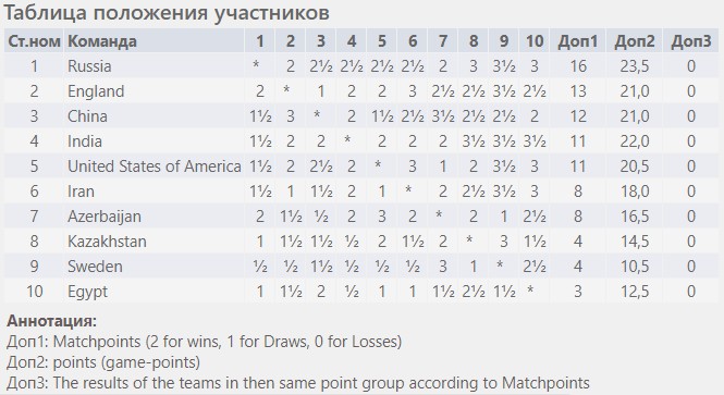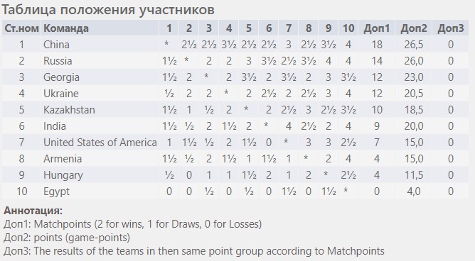 В результате сборная Китая выиграла турнир со 100-процентным результатом, 18 очков из 18. Россиянки остались на второй позиции (14 очков). Украинки набрали одинаковое количество очков с командой Грузии (по 12), но у соперниц оказался лучше дополнительный критерий (23.0 против 20.5 малых очков). Таким образом, сборная Украины финишировала на 4-й позиции и осталась без медалей.