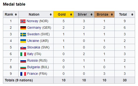 Выше украинцев расположены только ведущие сборные Норвегии, Германии и Швеции. А вот команда России находится лишь на 7-м месте с двумя медалями. Обращает на себя внимание низкая позиция сборной Франции – они довольствуются лишь тремя бронзовыми наградами, а многолетний лидер команды Мартен Фуркад подошел к турниру в плохой форме и до сих пор медалей не имеет.