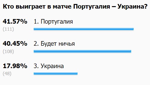 В свою очередь, читатели Sport.ua больше верили в национальную команду, почти 60 процентов проголосовали за то, что сборная Украины не проиграет. На победу Португалии ставили чуть более 40%.