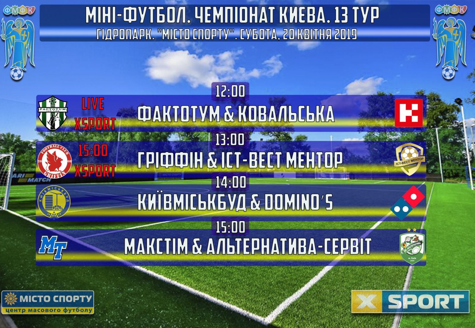В столичном Гидропарке в субботу 20 апреля пройдут матчи 13 тура чемпионата Киева по мини-футболу (6 на 6).