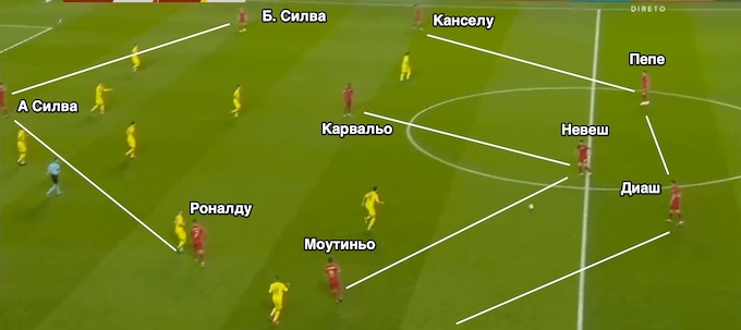 Оказавшись в трудном положении в центре поля, португальцы поняли намек Шевченко и пошли искать свое счастье на флангах. Невеш начал активно двигать мяч на фланги, а основной упор был сделан на правый фланг, где находился всегда активный в нападении Канселу, Бернарду Силва, кто-то из пары Карвальо/Моутиньо, а периодически еще и Роналду туда смещался.