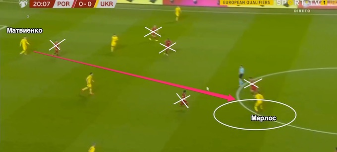 Использование плеймекерских качеств Матвиенко, во-первых, позволяло продвигать мяч вперед, отрезая одним пасом 3-5 игроков Португалии, во-вторых, позволяло отодвигать мяч от своих ворот, не используя энергозатратные комбинации, описанные разделом выше. Интересно, знал ли Фонсека о таких вариантах использования талантов Коли (и развивал ли он их?) или это Шевченко раскрыл украинского защитника по-новому?