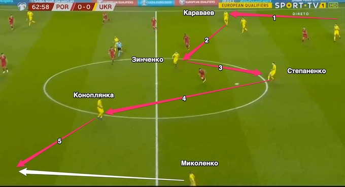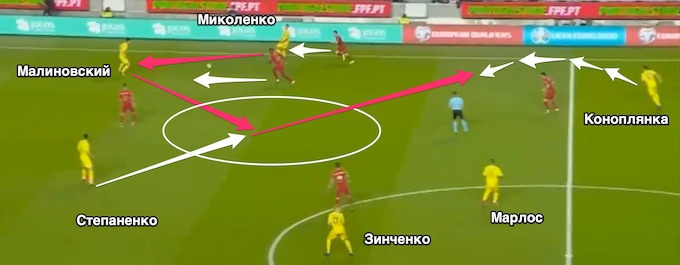 Португалия не является лучшей прессингующей командой, но выходы из прессинга команды Шевченко точно заслужили похвалы. Подопечные Шевченко постоянно оказывались либо в большинстве, либо в равном количестве на разных клаптиках поля. Зинченко, Марлос, Коноплянка, Малиновский, Степаненко – все они добавили в понимании друг друга и понимании того, где они должны находиться в каждой отдельной фазе атаки в зависимости от местонахождения игроков.