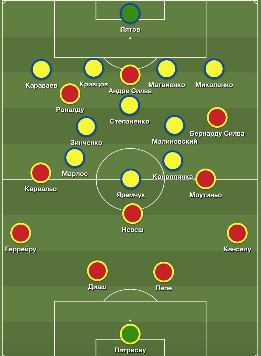 Шевченко не стал что-то выдумывать и показывать нам какие-то экспериментальные расстановки или игру в 5 защитников. Команда вышла в своих привычных 4-3-3 (4-3-2-1), в которых ставка привычно была сделана на компактность, мобильность и плотную игру на всех участках поля. В паре с Коноплянкой в старте вышел не Цыганков, а Марлос, поднявшийся с места центрального полузащитника. Место Марлоса занял Зинченко, а его партнерами были привычные Малиновский (левый центральный полузащитник) и Степаненко (опорник). У Португалии мы увидели 4-3-3, в которых акцент был сделан на правый фланг Бернарду Силвы и Канселу. Криштиану Роналду в привычной для себя манере много смещался в центр к Андре Силве, оставляя левый фланг Геррейру. Стоит отметить еще то, что место единственного опорного полузащитника занял не Вильям Карвальо, а Рубен Невеш, которому была отведена роль основного дирижера атак команды.