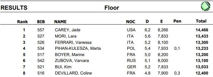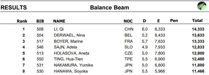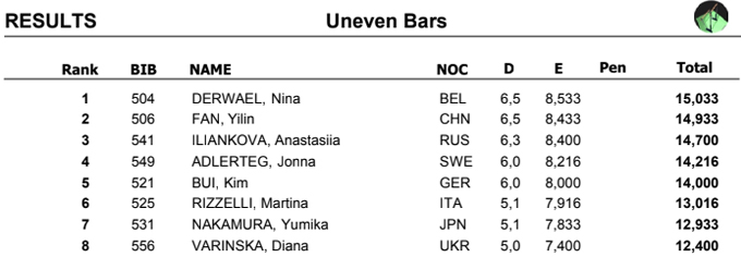 Победительницей стала действующая чемпионка мира из Бельгии Нина Дерваль с оценкой 15,033 (6,5). На втором месте китаянка Фан Илинь, которая получила 14,933 (6,5). Бронзовая медаль у россиянки Анастасии Ильянковой — 14,733