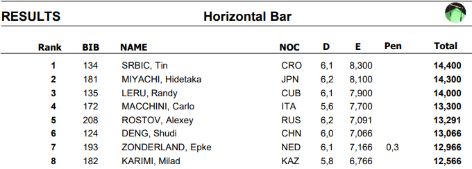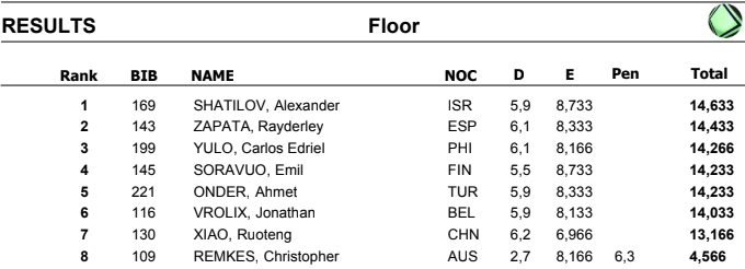 Победу одержал один из лидеров мужской сборной Израиля Александр Шатилов с оценкой 14,633 (5,9). На втором месте испанец Рэйдерлей Запата — 14,433 (6,1). Третье место занял молодой талант из Филиппин Карлос Юло — 14,266 (6,1).