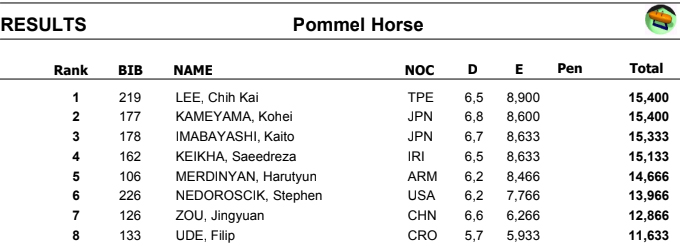 Очень интересные программы были показаны участниками финала на коне. Третью победу в серии этапов КМ в этом виде праздновал мастер из Китайского Тайбэя Ли Чи Каи. За свою комбинацию он получил 15,400 при базе 6,5. Таким образом, в его активе уже 90 очков в рейтинге и он является главным претендентом на приобретение индивидуальной лицензии на Олимпиаду в Токио.