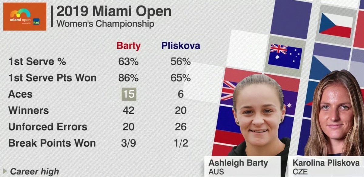 Австралийка Эшли Барти (№11 WTA) выиграла финальной поединок на турнире серии Premier Mandatory в Майами. 22-летняя теннисистка в двух сетах обыграла чешку Каролину Плишкову (№7 WTA).