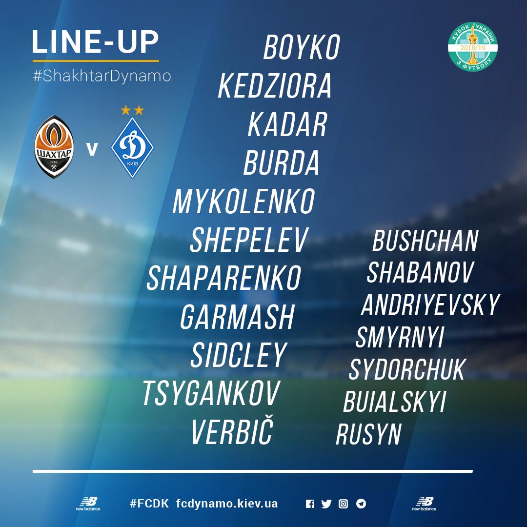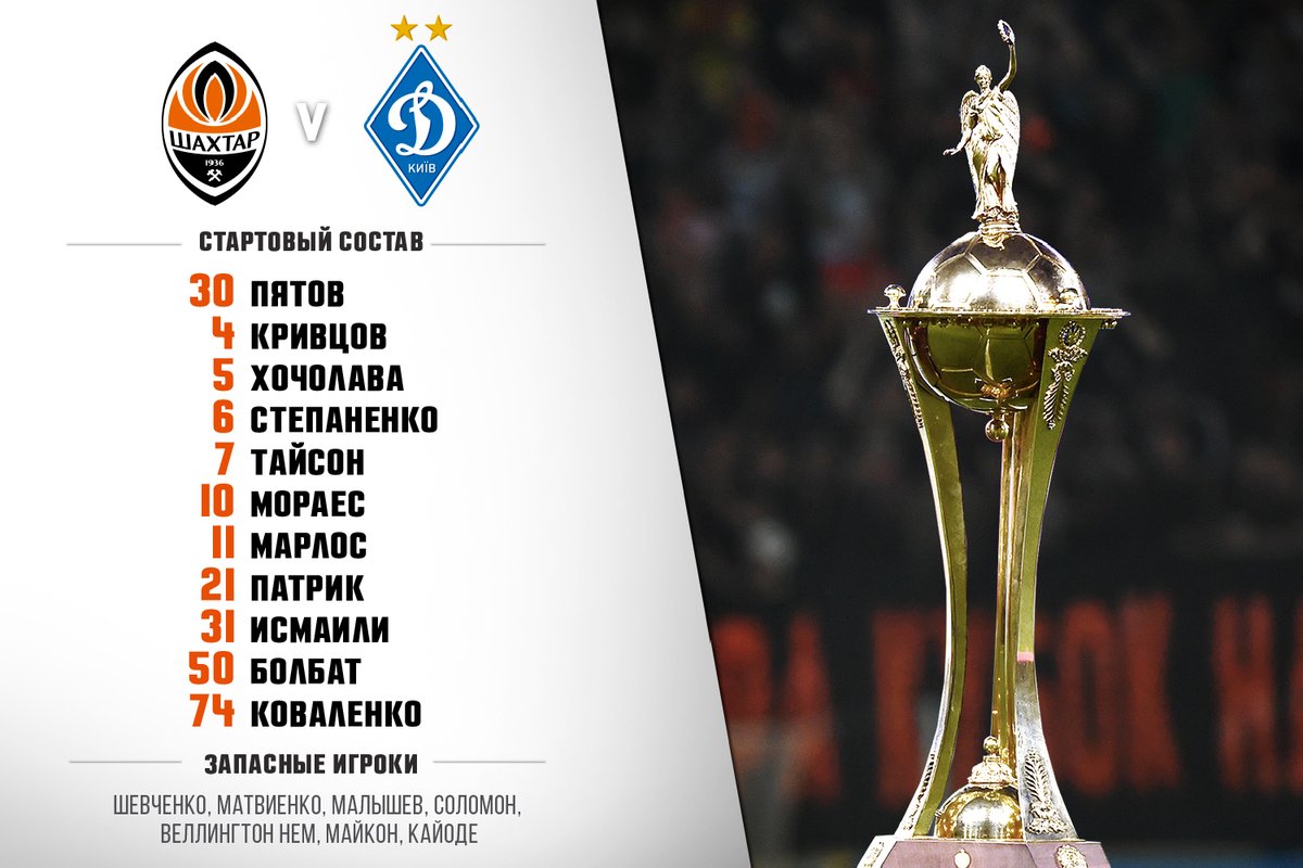 «Шахтер»: 30. Пятов, 4. Кривцов, 5. Хочолава, 6. Степаненко, 7. Тайсон (К), 10. Мораес, 11. Марлос, 21. Патрик, 31. Исмаили, 50. Болбат, 74. Коваленко.