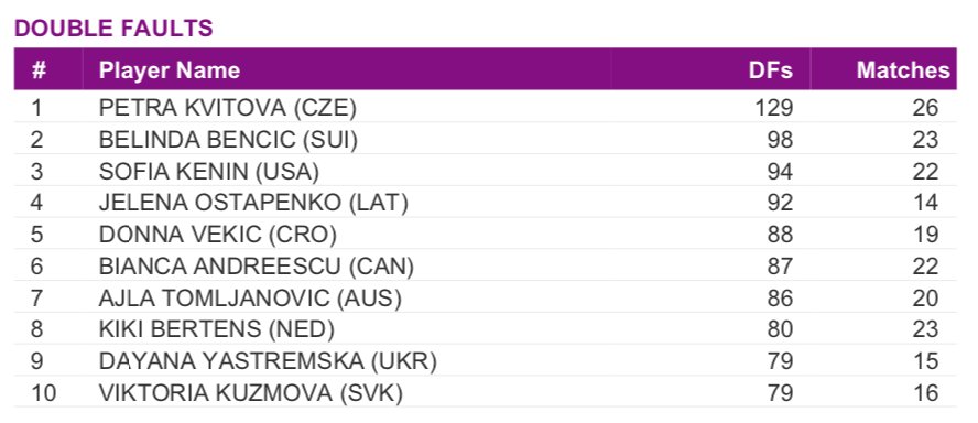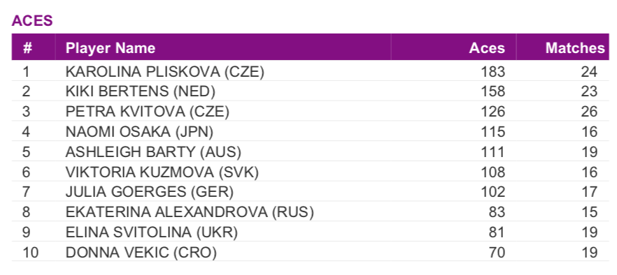 Первое место с солидным отрывом занимает чешка Каролина Плишкова (183), на втором – Кики Бертенс из Нидерландов (158). Замыкает тройку лидеров еще одна чешская теннисистка Петра Квитова (126). Стоит также выделить 20-летнюю словачку Викторию Кужмову, которая в 16-ти матчах 108 раз подала навылет. В пересчете на средние показатели за матч это даже больше чем у Квитовой.