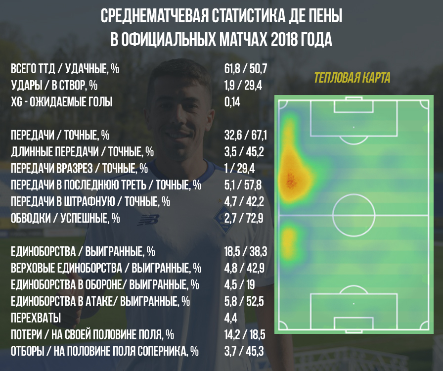В целом де Пена – достаточно работоспособный футболист, который не только любит играть на атаку, но и не брезгует помогать обороне. Что правда, с качеством ведения единоборств далеко не все у новобранца «Динамо» хорошо, что подтверждает и статистика.