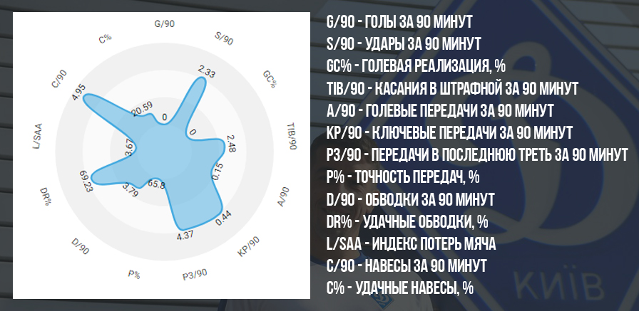 Если же взглянуть на «радар» футболиста, охватывающий статистику за несколько последних его сезонов, то станет ясно – Карлос де Пена любит оказываться в штрафной соперника, бить по воротам, выполнять ключевые передачи и передачи в последнюю треть поля, идти в обводку, а также активно использует навесы. Все это способно пригодиться ему для акклиматизации и становлении в «Динамо».
