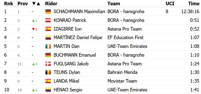 Максимильян Шахманн одержал третью победу на нынешнем Туре Страны Басков, выиграв четвертый этап многодневки. Он опередил Тадея Погачара и Якоба Фугльсанга, сумел укрепить лидерство в общем зачете.