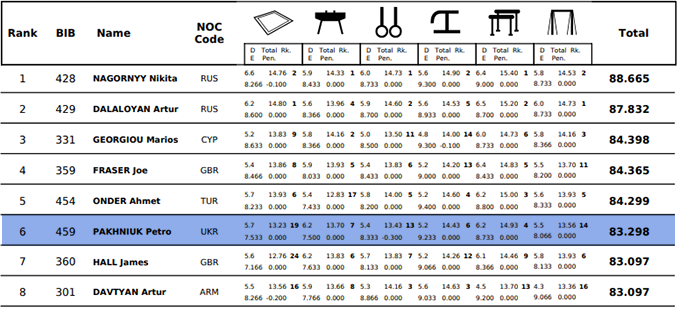 Помарки на вольных, коне и кольцах отодвинули его на 6-е место, что тоже очень достойный результат. Видно было желание выступить по максимуму и бороться до последнего.