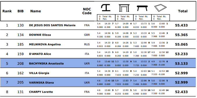 Настя и Диана уверенно прошли все четыре вида, не допустив падений и каких-то грубых ошибок. В итоге они набрали практически равные суммы: 53,133 балла у Насти и 52,999 балла у Дианы, что является 5-м и 7-м итоговыми результатами соответственно.