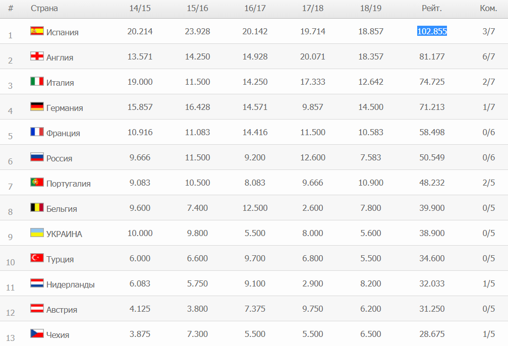 Таблица коэффициентов УЕФА. Испания и Нидерланды набирают очки