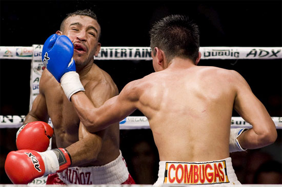 В объединительном поединке чемпионов WBA и WBC в первом легчайшем весе победил последний, то есть, Кристиан Михарес. Он на фото справа, а вот Алехандро Муньос слева и как раз получает подтверждение превосходства Михареса.